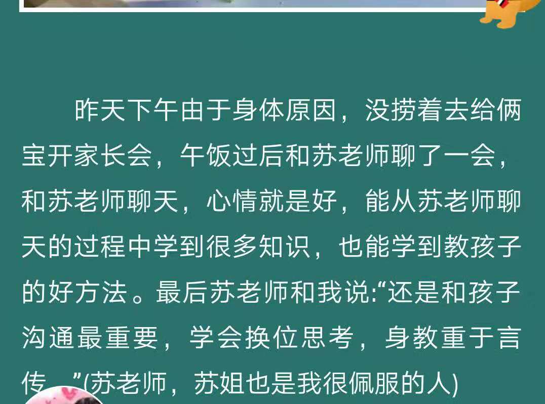 一位双胞胎妈妈,遇到问题就问我,拿我的话当金科玉律,孩子这段时间不爱读书,那段时间有点逆反,诸如此类的问题,这位家长频频问出,我一一和她沟通,为她出谋划策。