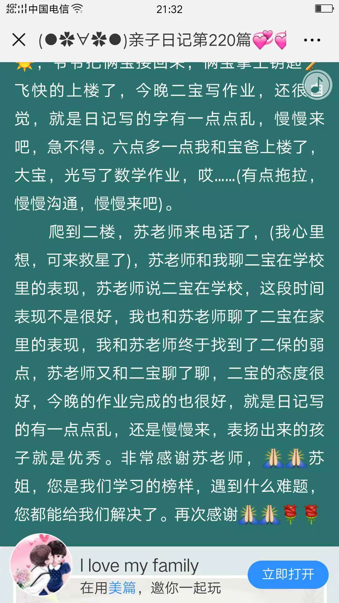 我是一名小学语文教师,同时在学校的教导处工作,但我还是一个妈妈,一个 9 岁女孩的妈妈。老师的“师道尊严”经常被我带入家庭,不经意间,亲子关系不够亲密。比如,练琴的时间到了,我更多的是要求,而不是商量,女儿比较反感,我也感到冤枉。听了仇老师的课,我马上改变自己,遇事和孩子民主交流,坚持写了 260 多篇亲子日记,极大地改善了亲子关系。女儿在日记中写道:“我的妈妈变了,变得温柔了,变得可爱了 …… ”我想,作为一个妈妈,这应该是最大的幸福吧。